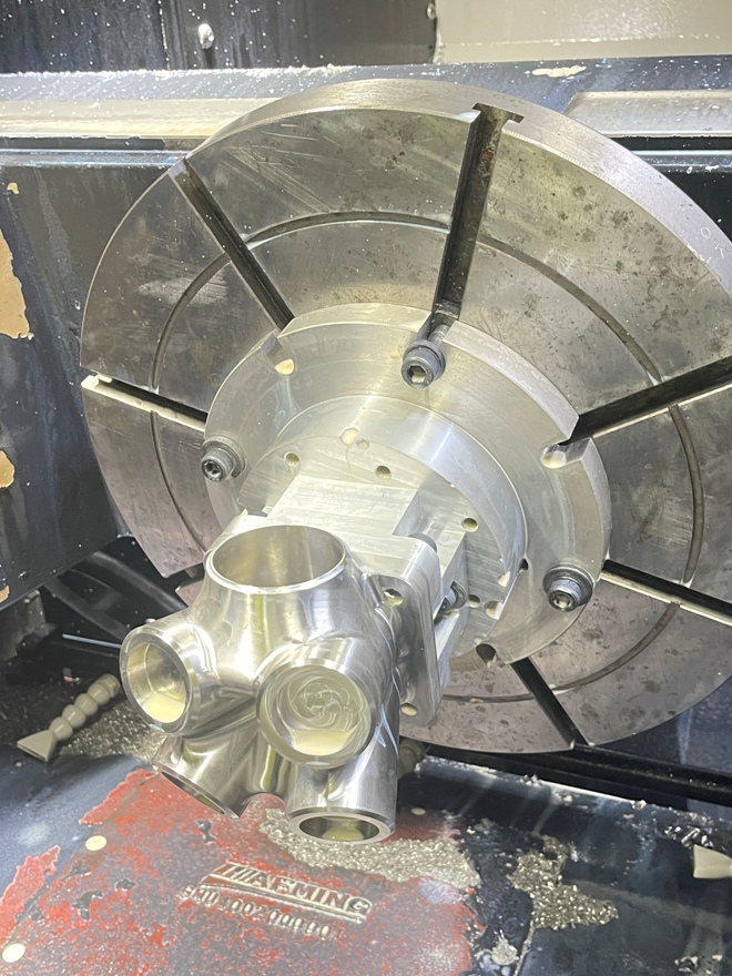 案例简介:不锈钢阀体零件,腔体全部掏空,不锈钢材料又硬又粘刀,非常不好加工,而且易变形,为控制变形量,三轴开粗2序,五轴正反面中粗和光刀各2序。